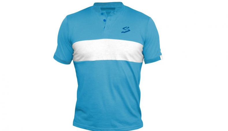 O padrão azul com a banda branca faz lembrar as camisolas de ciclismo de antigamente, bem como os botões no colarinho, contudo este tecido é muito mais confortável, fresco e respirável do que aquele que era utilizado há mais de 30 anos.